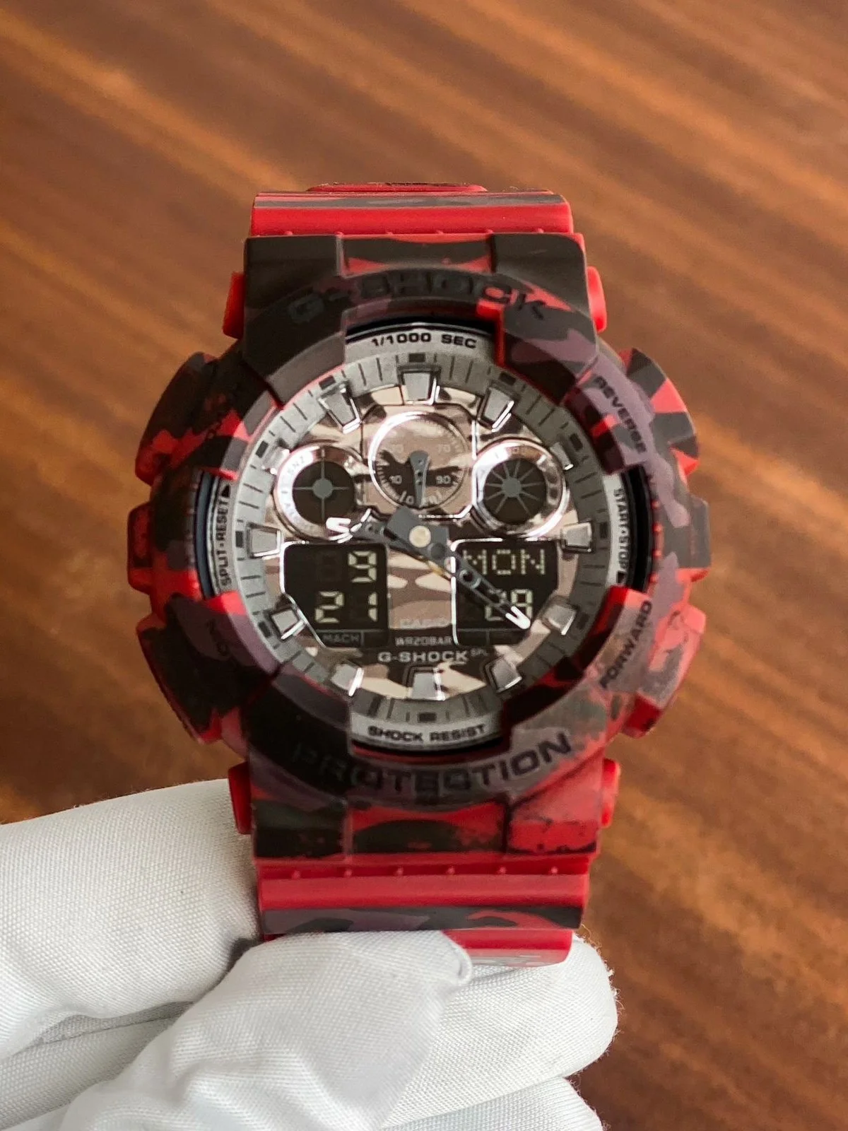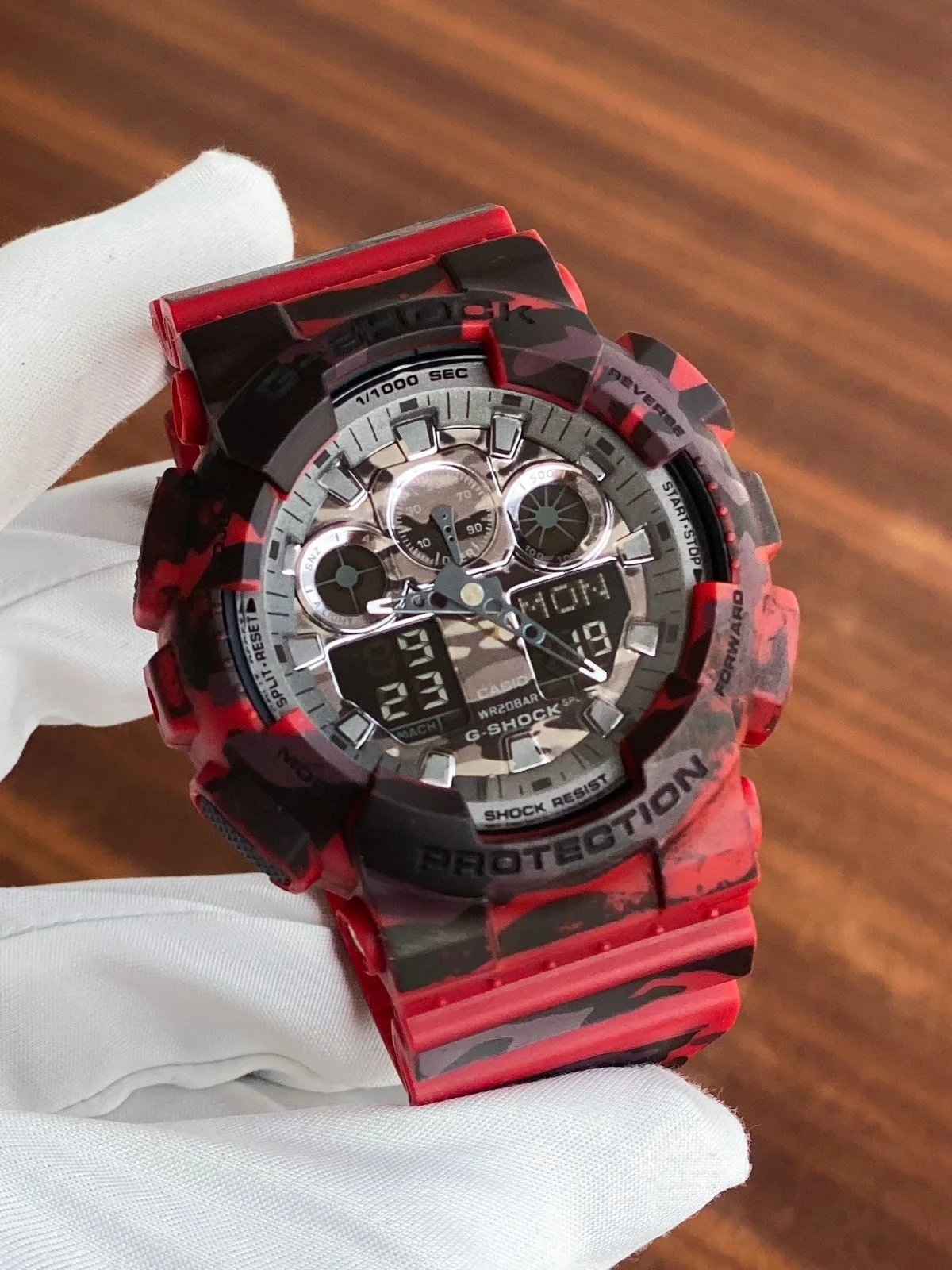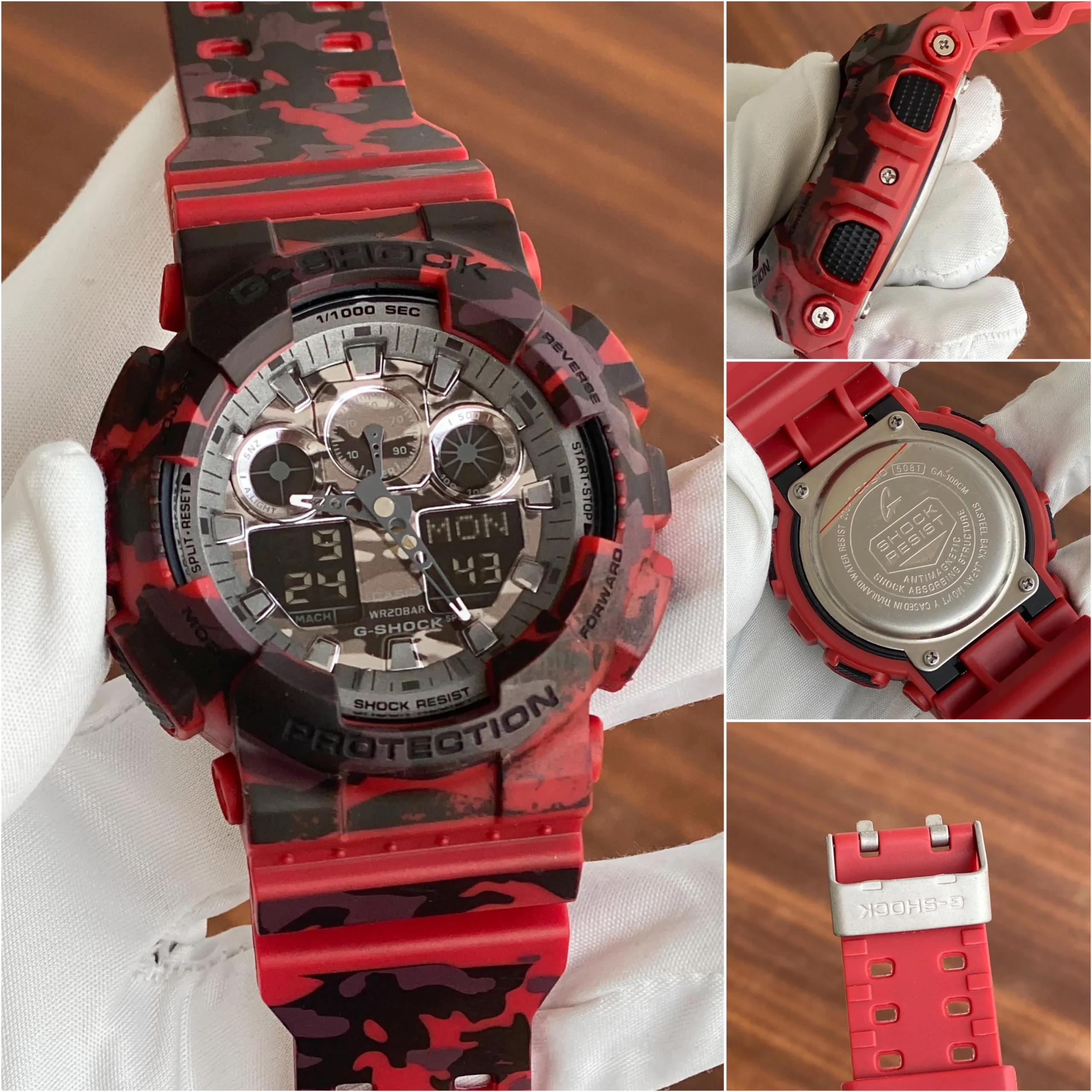 Camouflage Series This model was created by dressing up the big bold case of GA-100 Series models in popular camouflage patterns. Everything from the case and band, to the face is done in camouflage. This model adopt a woods-and-camouflage motif. This new camouflage model not only highlight G-SHOCK toughness, it also looks great with today’s casual fashions.