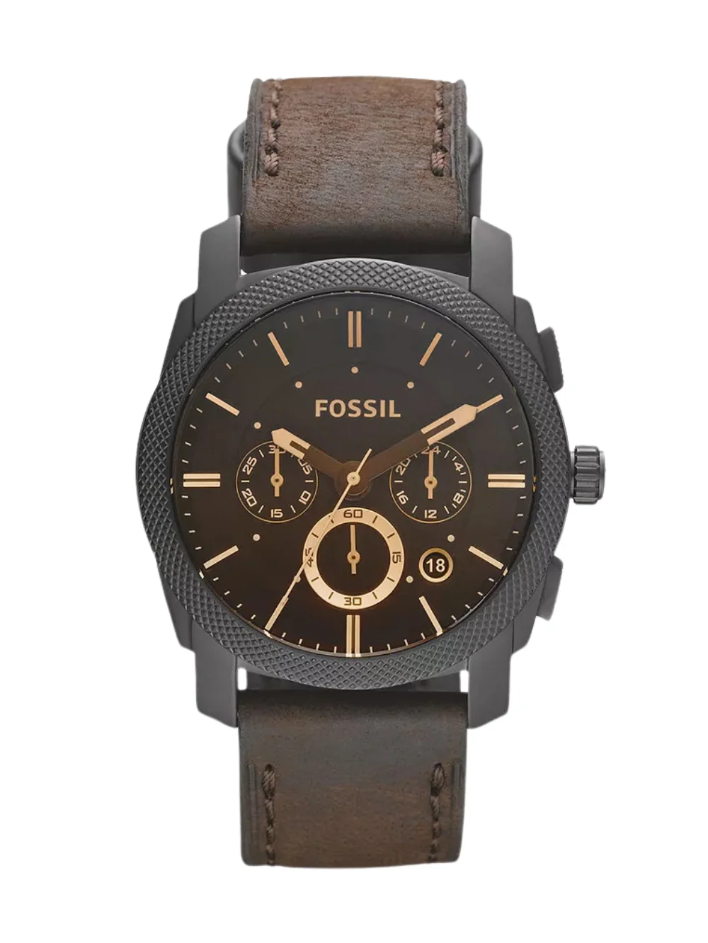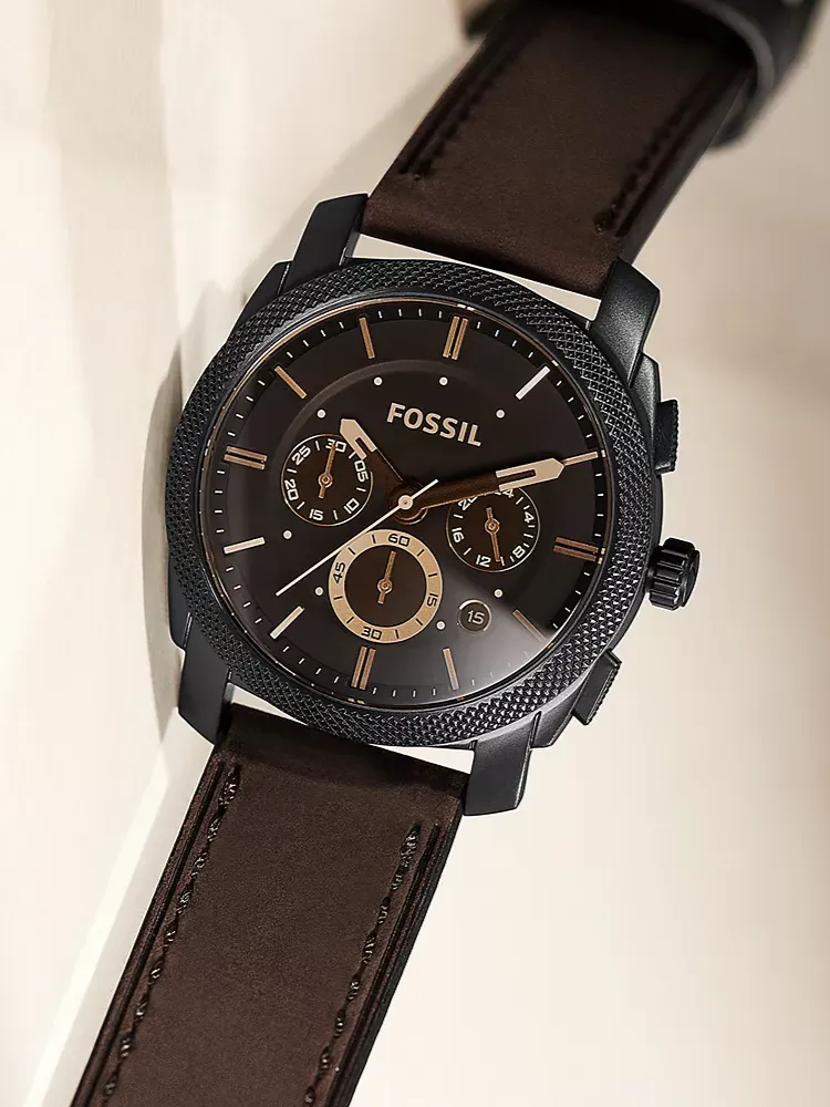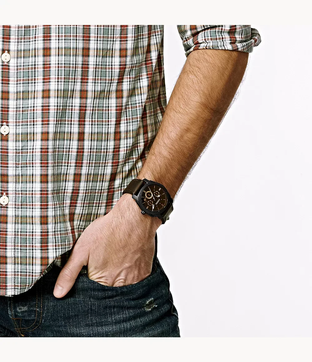 Lending a contemporary twist to an elegant design, this men analog watch from Fossil is a must-have wrist essential. Its strap comes in a shade of brown that elevates the look of the watch. The brown round dial is secured by a mineral glass and is housed in a case. It exudes chronograph, and a crown for time adjustment. Furthermore, it is completed with a buckle clasp to ensure a secure fit on the wrist.