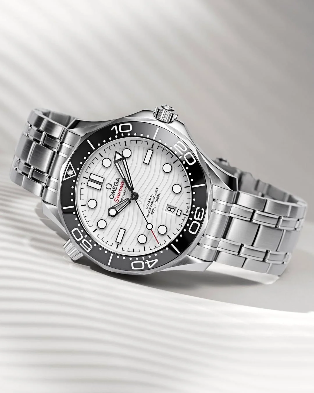 This 42 mm model is crafted from stainless steel and includes a black ceramic bezel with a white enamel diving scale. The dial is polished white ceramic and features laser-engraved waves and Seamaster highlighted in red.