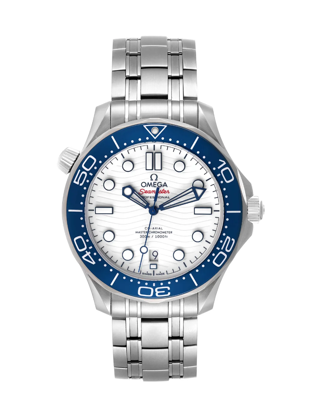 This 42 mm model is crafted from stainless steel and includes a black ceramic bezel with a white enamel diving scale. The dial is polished white ceramic and features laser-engraved waves and Seamaster highlighted in red.