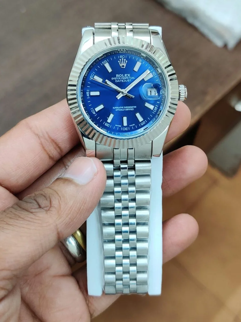 Case is made of stainless steel most of which is high-polish finished with the exception of the back of the lugs and center of the case back. Mounted atop the case is a high-polish finished 18k white gold fluted bezel. Crown and case back are both screw-down. As for the jubilee bracelet, it is stainless steel as well but with high-polish finished center links and brush-finished outer links (fits up to a 7.25 inch wrist).