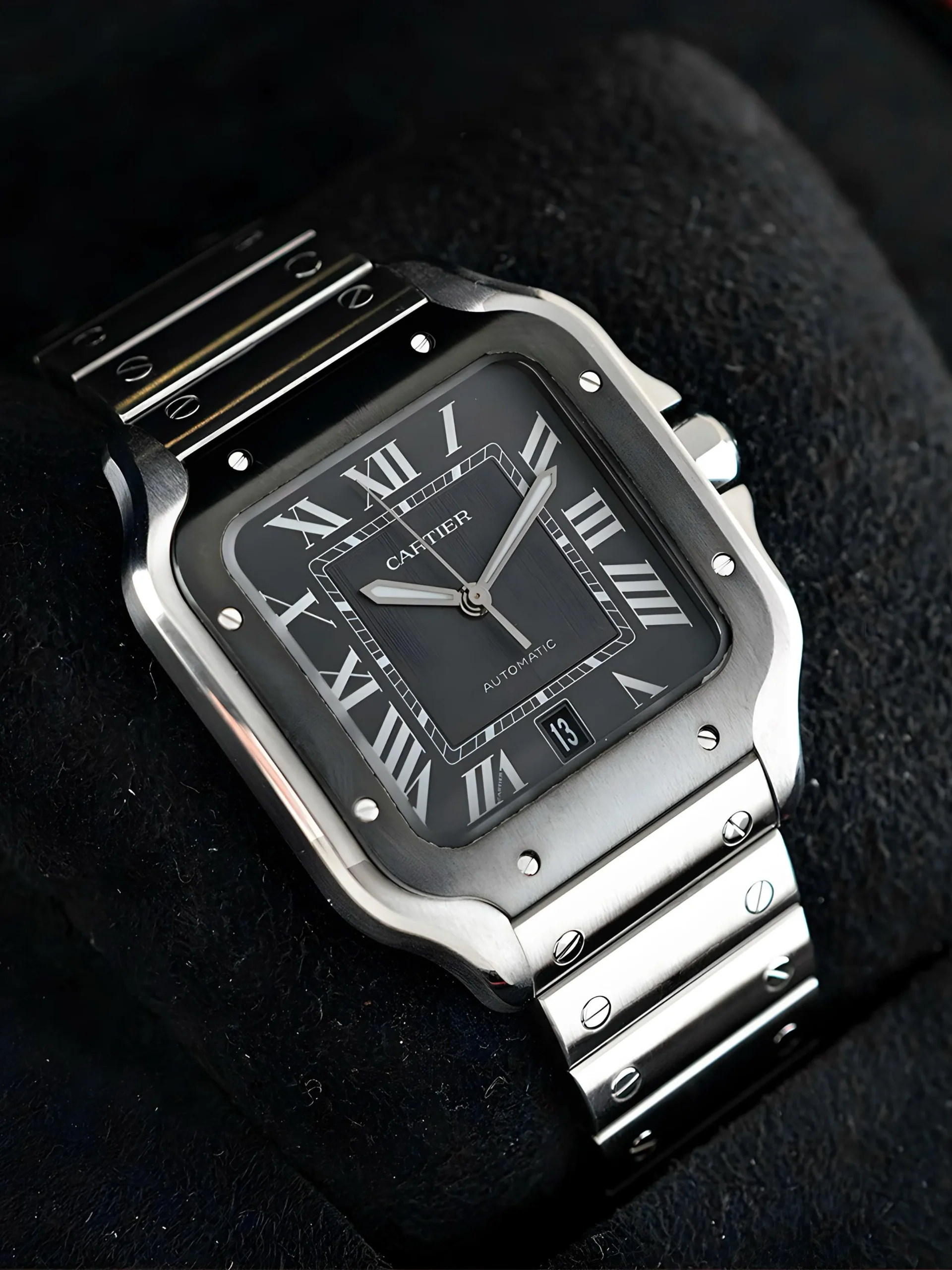Santos de Cartier watch, large model, Manufacture mechanical movement with automatic winding, caliber 1847 MC. Steel case, ADLC bezel, steel crown set with a faceted black synthetic spinel, gray dial, steel sword-shaped hands with luminescent material, sapphire crystal. Steel bracelet with “SmartLink” adjustment system. Second strap in black rubber, with interchangeable steel deployant buckle. Both bracelets are fitted with the “QuickSwitch” interchangeability system. Case width: 39.8 mm, thickness: 9.38 mm.
